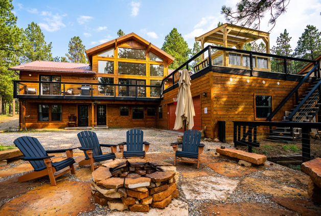 6 bedrooms and 6 bath; 11 beds total. Large double-decker porch, spa bathrooms, hot tub, and gorgeous custom-designed interior. Out in the woods!